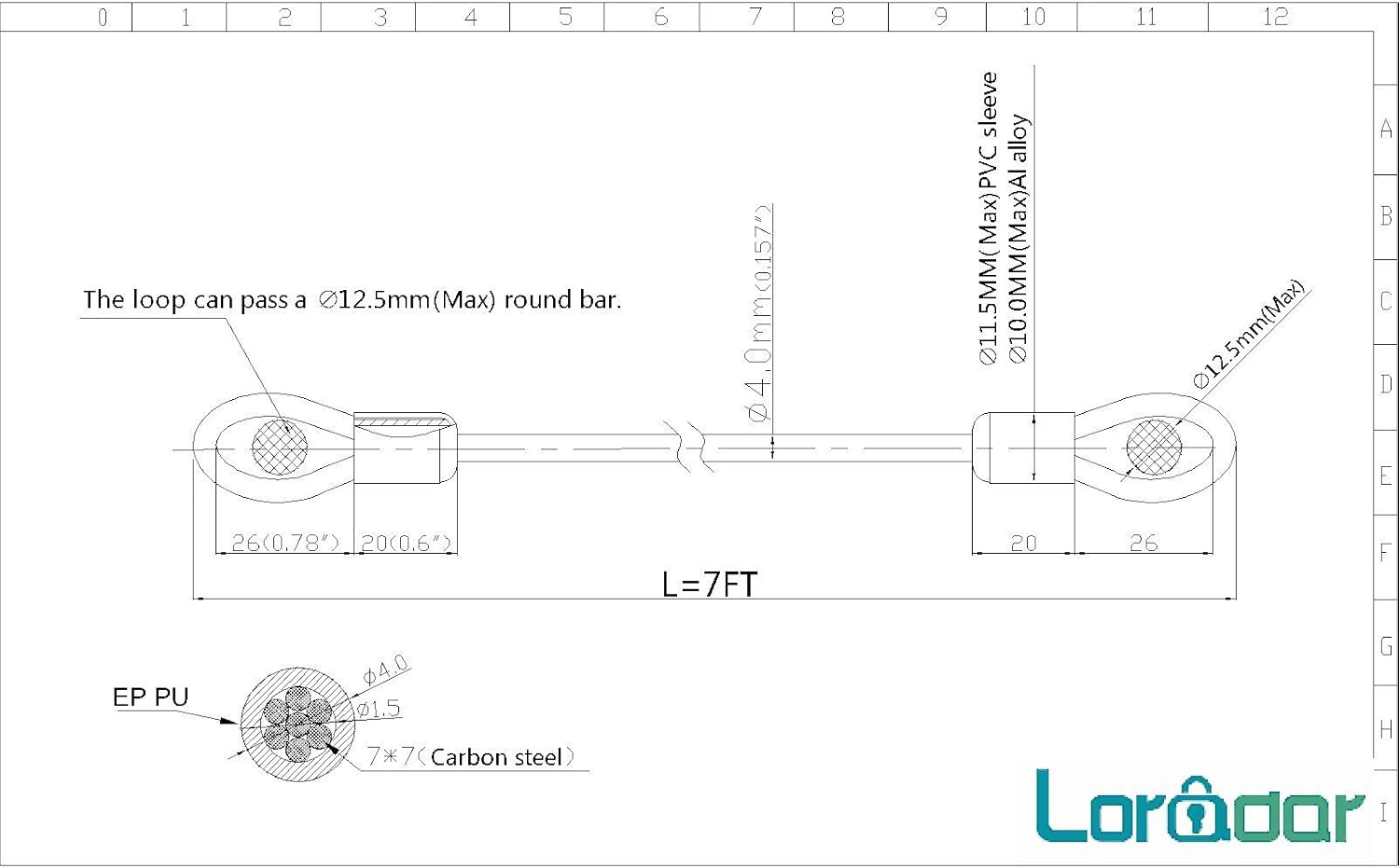 - *Environmental protection PU+7*7 Carbon steel ,Length:7Feet , Diameter:4mm(5/32"). Colour:Black transparent. Weight: 2.3oz per safety cable ,light and flexible, easy for carry to secure bags