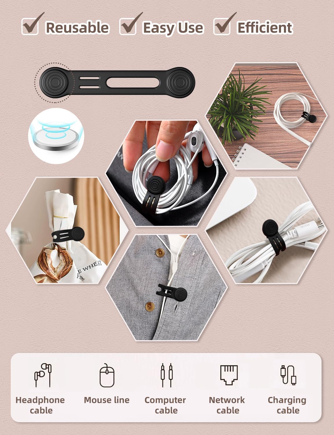 - ◎User Friendly — Simply twist the wire to the desired length, the cable ties with magnet will snap together automatically. Without leaving residue or causing damage. Plus, they won't interfere with data transfer on charging cables, USB, or earbuds.