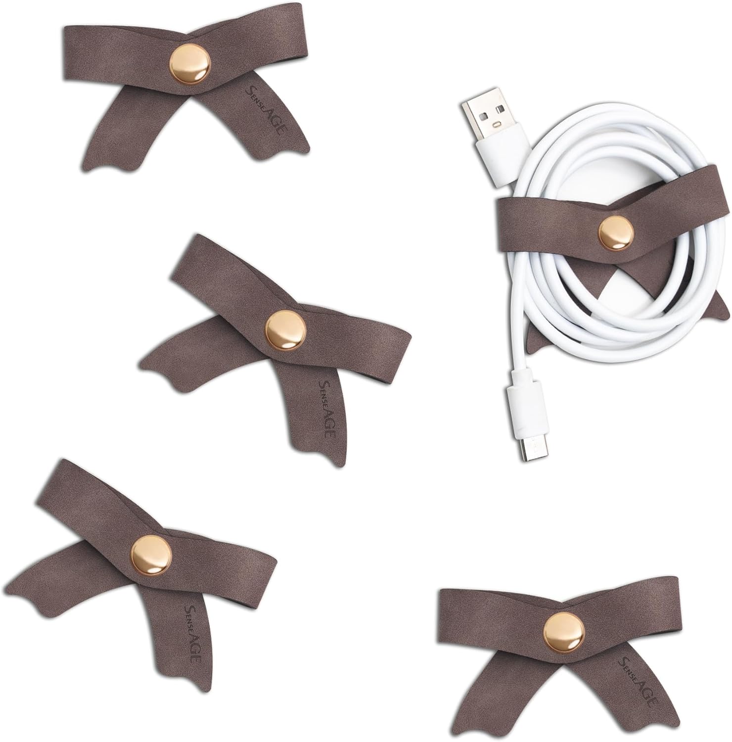 SenseAGE 5 Pack Cord Organizer, Bow Cord Keeper, Cable Organizer USB Holder, Leather Cable Management, Cable Straps, Earphone Winder, Storage Straps for Electronics, Earbuds (Choco Brown, Big)