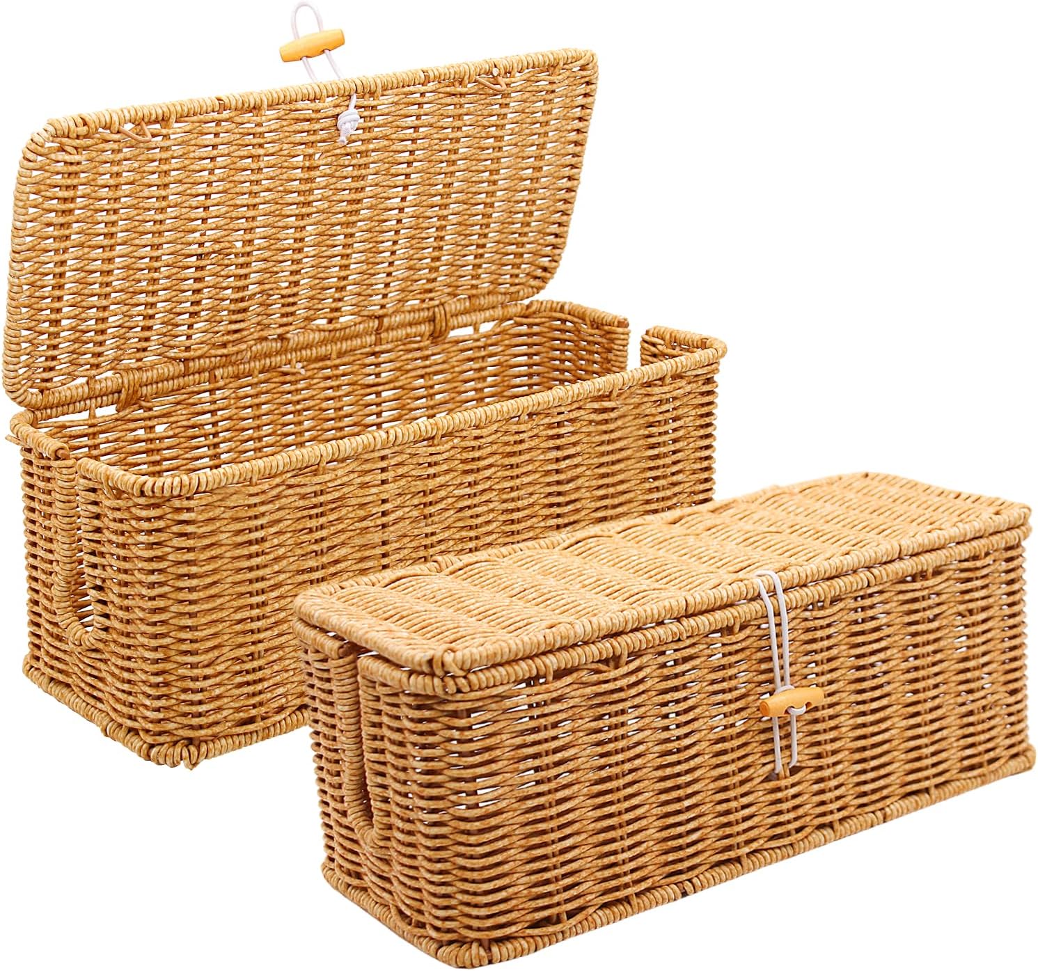 2PCS Cable Management Box, Handmade Rattan Cable Organizer, Open Slots Cords Hider Box, Under Desk Cord Organizer for Computer Router USB Hub & Power Strip