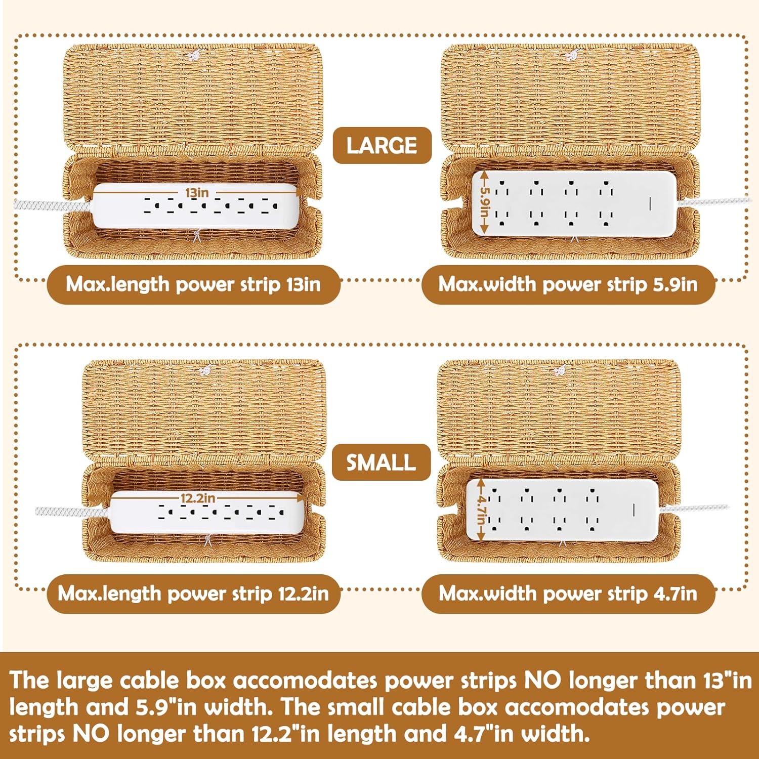 - Large Capacity: This cable box with size 13.0" (L) x 5.5" (W) x 5.1" (H), accommodates power strips up to 12.5" in length and 4.7" in width. This cable box with size 13.8" (L) x 6.7" (W) x 5.9" (H), accommodates power strips up to 13.0" in length and 5.9" in width. Say goodbye to cable chaos! Our cord box organizer features two entry and exit points, making it easy to connect your devices without the mess.